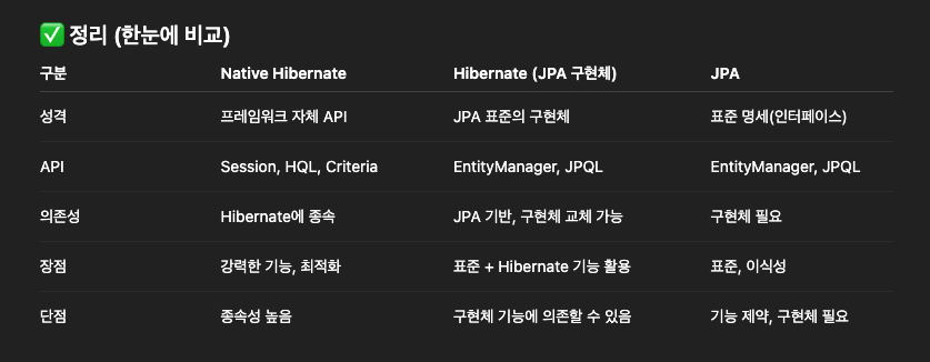 - 네이티브 하이버네이트 API 사용 == 프레임워크에 코드가 종속됨